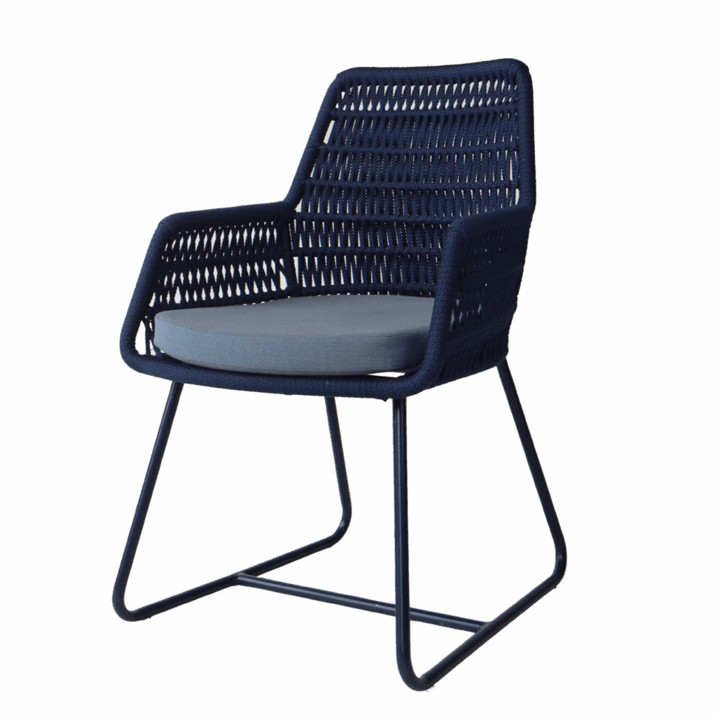 Cadeira em alumínio com tecimento em corda naútica, acompanha almofada de assento.