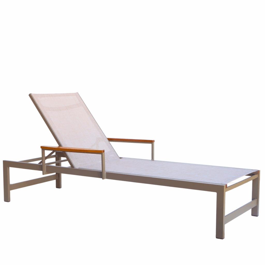 Conheça a coleção de espreguiçadeiras Medina: chaise em tela sling, com bandeja lateral opcional em madeira.