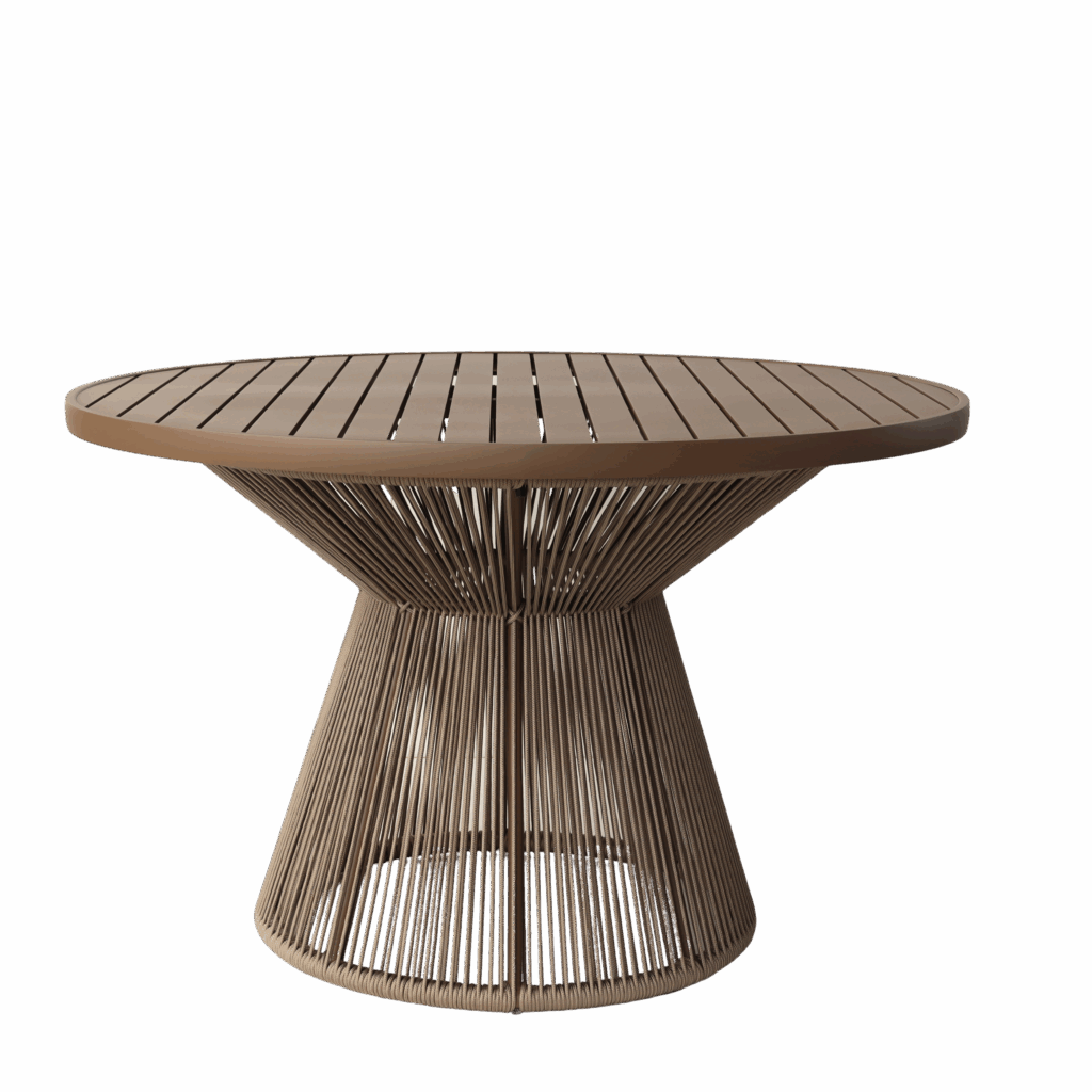 A base de mesa Ampulheta possui um tecimento vertical em corda náutica, e serve como apoio para tampos de vidro ou madeira, ou de alumínio ripado.