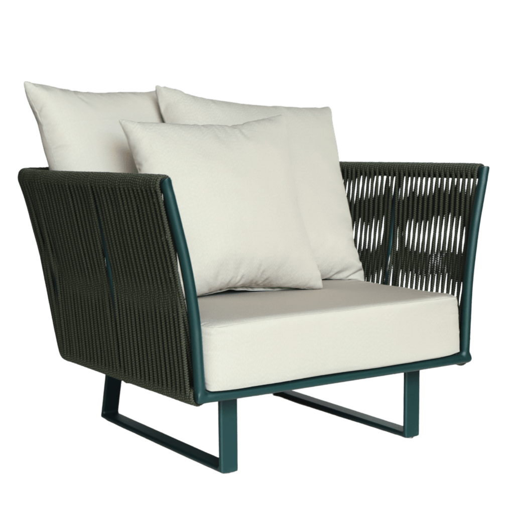 A linha DNA é composta de sofás e poltronas em alumínio, com tecimento retorcido em fita náutica. Acompanha almofada no assento e decorativas para encosto. Opcional tecimento em fibra sintética e tricô náutico ou em corda redonda.